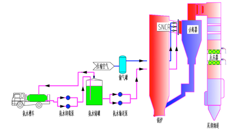 SNCR+SCR聯合脫硝技術是在煙氣溫度為800-1050℃范圍內,將適量稀釋后的還原劑(氨水或尿素溶液)噴入爐膛內,其在高溫條件下瞬間蒸發分解成氣態氨,氨氣與煙氣充分混合,在高溫區(800-1050℃)區域,氨(NH3)直接與煙氣中NOx反應,將NOx還原成N2和H2O。然后在鍋爐尾部合適的煙氣溫度區間(320℃~400℃),增加SCR催化劑或者引出SCR脫硝煙道到反應器進行,還原劑氨(NH3)與煙氣中NOx,通過催化劑的作用發生反應,將NOx還原成N2和H2O。