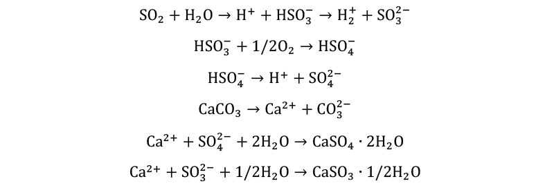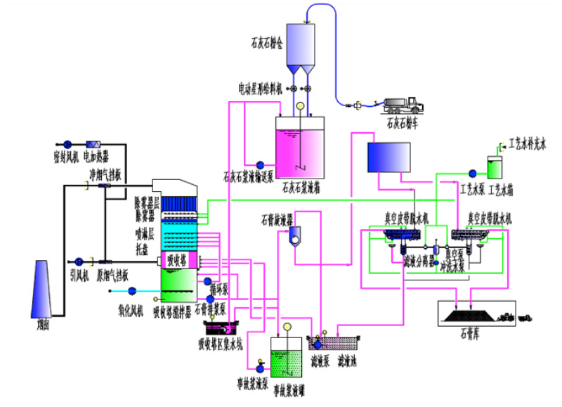石灰石-石膏法脫硫技術是采用石灰石或石灰的漿液吸收煙氣中的,屬于濕法洗滌法,該方法的產物是石膏。石灰石石膏脫硫工藝成熟、性能可靠,脫硫效率達到以上。反應方程如下: