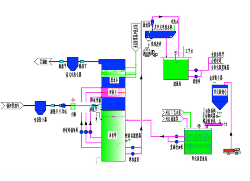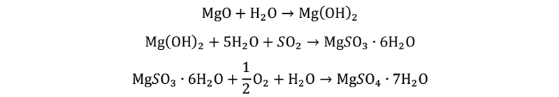 氧化鎂脫硫技術是將氧化鎂作為吸收劑吸收煙氣中的,可生產含結晶水的亞硫酸鎂和硫酸鎂。可將反應物從吸收液中分離出來,并進行干燥,最后將干燥的壓硫酸鎂和硫酸鎂進行煅燒分解,再生成氧化鎂可作為脫硫劑。氧化鎂法脫硫工藝成熟、性能可靠,脫硫效率達到以上。反應方程如下: