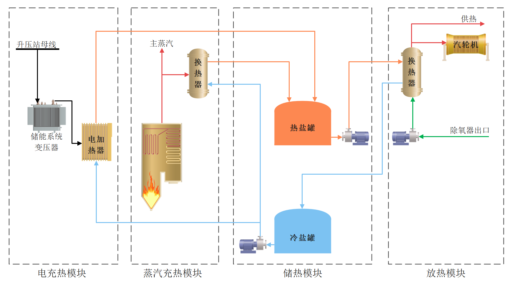 1)蓄熱過程:采用以電或蒸汽為加熱源,通過加熱熔鹽存儲熱能,產生高溫熔鹽;